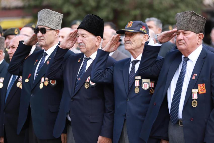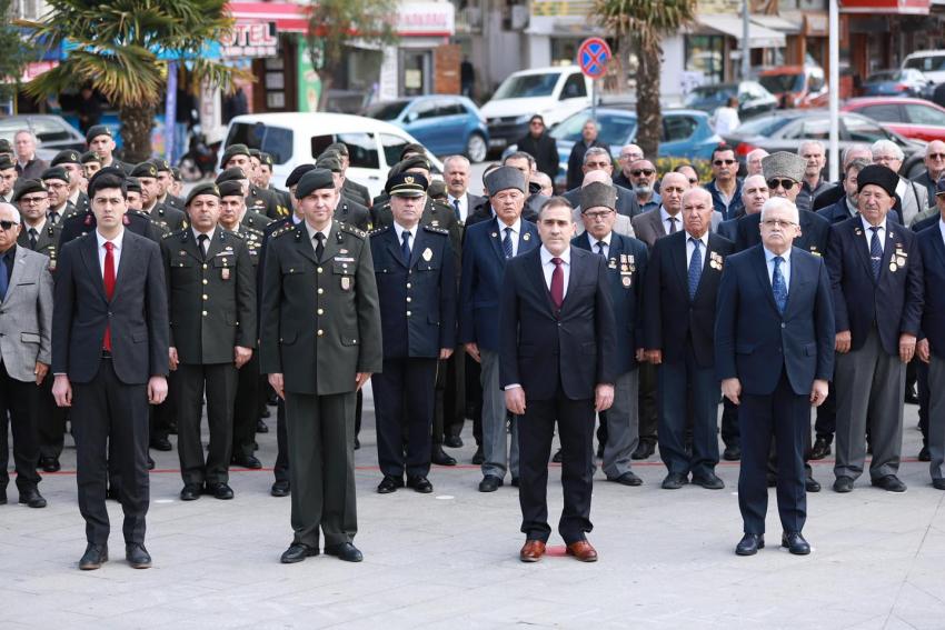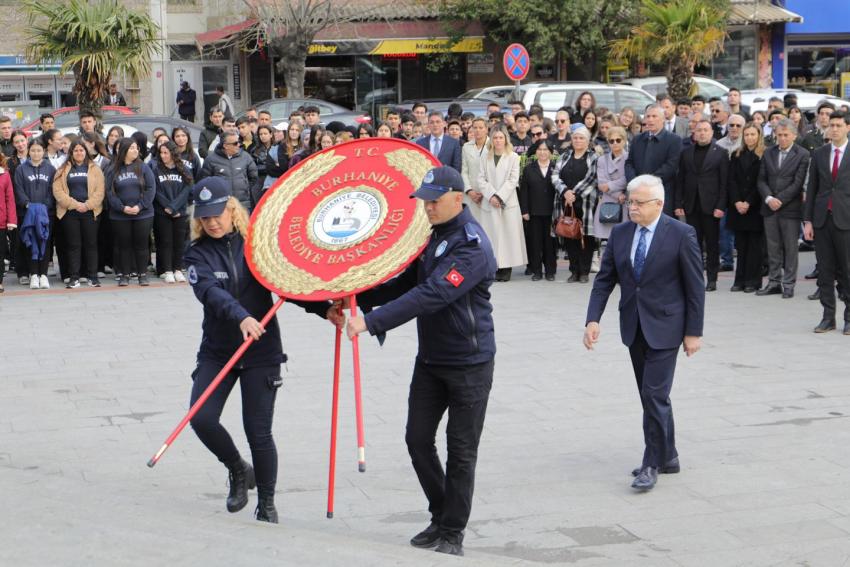 Program, saat 10.40'da Cumhuriyet Meydanı'nda Atatürk Anıtı'na çelenklerin sunulmasıyla devam etti. Düzenlenen çelenk sunma töreninde, Burhaniye Kaymakamı İlyas Memiş, Burhaniye Belediye Başkanı Ali Kemal Deveciler, Burhaniye İlçe Garnizon Komutanı Vekili İstihbarat Yarbay Yusuf Parmaksızoğlu, Burhaniye Cumhuriyet Başsavcı Vekili Berkay Şahingöz, Burhaniye İlçe Emniyet Müdürü Faik Karabaş, Burhaniye İlçe Jandarma Komutanı Binbaşı Ünal Bayhan, şehit yakınları ve gazilerimiz, Burhaniye Belediye Başkan Yardımcıları Oktay Erbalaban, Tamer Midilli ve Ayten Tuna, CHP Burhaniye İlçe Başkanı Aylin Yıldırım, Burhaniye İlçe Milli Eğitim Müdürü Bora Zihni, Burhaniye Belediye Meclis Üyeleri Aşkıbirce Uzkurt ve Esra Ersoy, siyasi parti üyeleri, sivil toplum kuruluşlarının temsilcileri, öğretmenler ve vatandaşlar törende hazır bulundu. Kaymakamlık, İlçe Garnizon Komutanlığı ve Burhaniye Belediye Başkanlığı çelenklerinin Atatürk Anıtı'na sunulmasından ardından saygı duruşu ve İstiklal Marşı okundu.