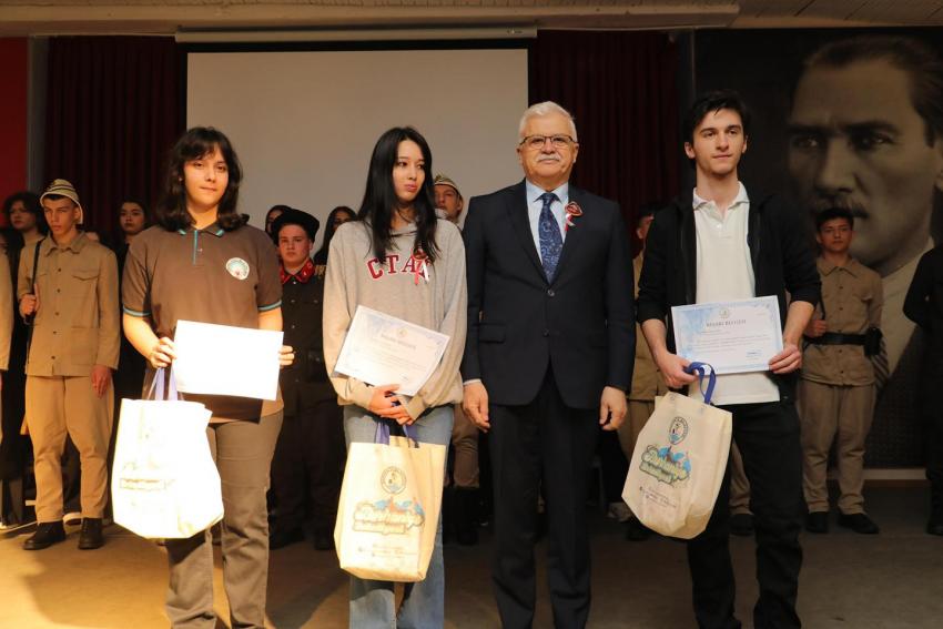 Şiir yarışmasında dereceye giren Cansu Doğa Kılıç, Sabri Korkak, Ela Çelik’e ödüllerini Burhaniye İlçe Garnizon Komutanı Vekili İstihbarat Yarbay Yusuf Parmaksızoğlu takdim etti.