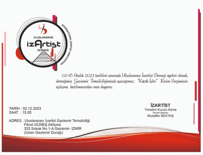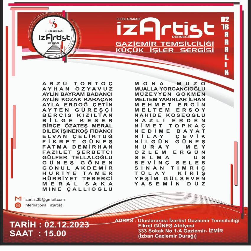 | Uluslararası İZARTİST Derneği Gaziemir Temsilciliği Fikret Güneş Atölyesi Galerisi’nde 2 Aralık Cumartesi günü saat 15.00’te  “Küçük İşler” isimli sergi sanatseverlerle buluşacak. Dernek üyesi 40 sanatçının eserlerinin yer alacağı sergi 16 Aralık tarihine kadar gezilebilecek. İZARTİST Derneği’nden yapılan açıklama şöyle: “Bu sergiyle Uluslararası İZARTİST Derneği Gaziemir Temsilciliğimizin açılışını da gerçekleştiriyoruz. Aynı zamanda yaptığımız sanatı sergileyerek, sanata gönül veren dostlarımızla paylaşmaktan onur duyarız. Derneğimiz Atatürk ilke ve inkılaplarına yürekten bağlı, özveri ile çıkar gözetmeksizin sanatı ve sanat üreten toplumun her kesimini kucaklayan, sevgi saygı, hoşgörü ve özeleştiri temelleri üzerinde kurulan, yenilenmeye açık, sanatçıların gelecek beklentilerine yön veren bir dernektir. Değişim, yaşamın değişmeyenidir. 2018 yılında Mona Muzo (Muzaffer Bektaş), İzmir Dokuz Eylül Üniversitesi Buca Eğitim Resim-İş Eğitimi Bölümü mezunları ve akademisyenleri ile birlikte Art İSTASYON Plastik Sanatlar Grubunu kurmuş, grubun küratörlüğünü üstlenmiş, ciddi çıkışlar yaparak resim, heykel, grafik, seramik, yağlıboya ve akrilik çalışmalarıyla 3 büyük sergi açmışlar, özgünlük ve sanatsal kalitede kendilerini kanıtlamışlardır. Aralarında görsel sanatlar öğretmeni olarak MEB’da çalışan öğretmenlerin yanı sıra akademisyen olan tüm disiplinlerden sanatçıları barındıran Art İSTASYON, İzmir Suluboya Ressamları Derneği ile birleşerek daha güçlü, cesaretli ve daha yenilikçi bir anlayışla, sağlam yıllanmış tecrübeler ile birlikte dernekleşerek daha ciddi bir ivme kazanmıştır.”   |