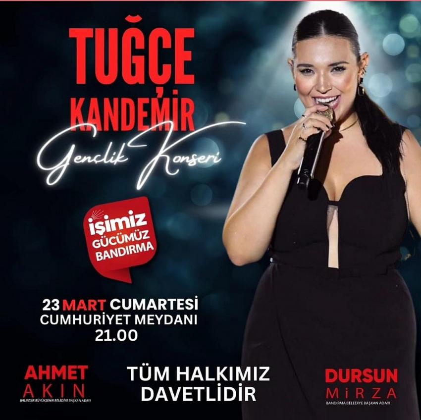 Son dönemin başarılı müzisyenlerinden Tuğçe Kandemir, 23 Mart Cumartesi akşamı saat 21.00’de Cumhuriyet Meydanı’nda konser verecek. Bu Benim Öyküm, Ah Ellerim Kırılaydı ve Kahverengi Gözlerin gibi şarkılarıyla tanınan başarılı sanatçı, CHP Balıkesir Büyükşehir Belediye Başkan Adayı Ahmet Akın ve Bandırma Belediye Başkan Adayı Dursun Mirza tarafından düzenlenen “Gençlik Konseri” kapsamında sahne alacak. Tüm Bandırmalıları meydanda buluşmaya davet eden Belediye Başkan Adayı Mirza, “Tuğçe Kandemir konserimize başta gençlerimiz olmak üzere tüm halkımız davetlidir” diye konuştu.