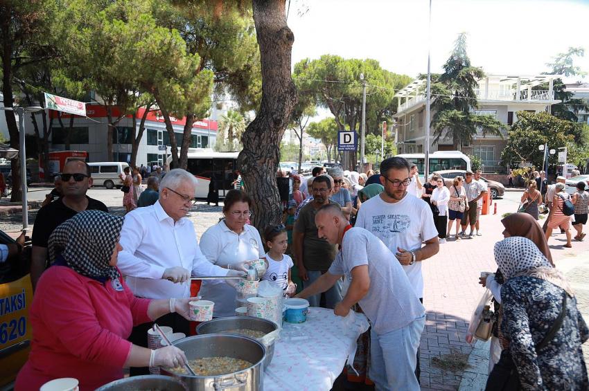 Burhaniye Belediyesi’nin her sene geleneksel olarak düzenlediği aşure hayrı Belediye hizmet binası önünde yapıldı. 3 ayrı noktada yapılan dağıtımda, Belediye Başkanı Ali Kemal Deveciler, Belediye Başkan Yardımcıları Tamer Midilli, Ayten Tuna ve Burhaniye Belediye Meclis Üyesi Muharrem Keskün vatandaşlara aşure ikramlarında bulundu.