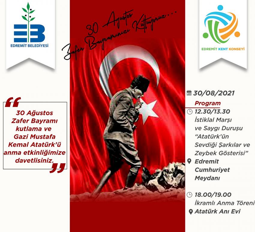 Edremit Belediyesi ve Edremit Kent Konseyi'nin ortaklaşa organize ettiği 30 Ağustos Zafer Bayramı Kutlama Ve Atatürk'ü Anma Etkinliği 30 Ağustos Günü önce Edremit Cumhuriyet Meydanı'nda sonrasında ise Atatürk Anı Evinde Gerçekleştirilecek