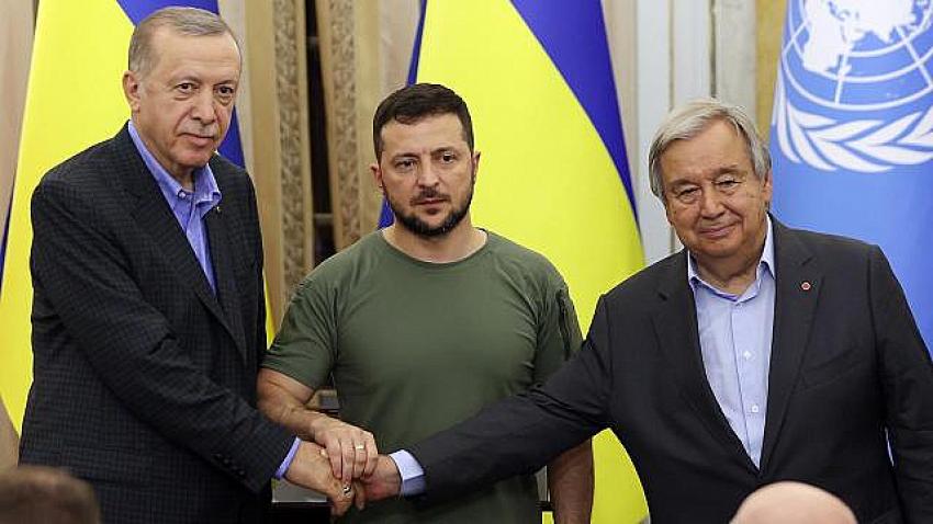 Cumhurbaşkanı Recep Tayyip Erdoğan, Ukrayna Devlet Başkanı Volodimir Zelenskiy ve Birleşmiş Milletler (BM) Genel Sekreteri Antonio Guterres, Potoçki Sarayı'nda üçlü zirvenin ardından ortak basın toplantısı düzenledi.
