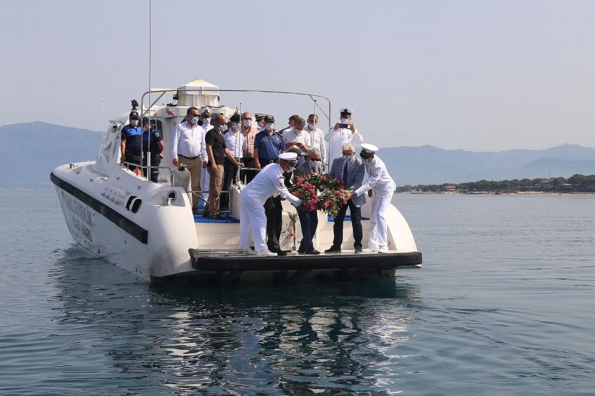 Törende deniz şehitleri için bir dakikalık saygı duruşunun ardından İstiklal Marşı’nın okunmasından sonra Kaymakam Belediye Başkanı ve Garnizon Komutanı ve Sahil Güvenlik Komutanı tarafından denize açılarak çelenk bırakıldı.