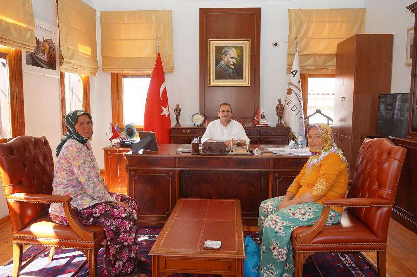 Ayvalık ilçesi Üçkabağaç kırsal mahallesinden Gülden Nur Bulut ve Mübeccel Bulut, Ayvalık Belediye Başkanı Mesut Ergin'i başkanlık makamında ziyaret ederek yaşadıkları sıkıntıları dile getirdi. Gülden ve Mübeccel teyzelerin sıkıntılarını dinleyen Başkan Ergin, program dahilinde gerekli çalışmaları başlatıp, sorunun çözümü için girişimde bulunacaklarının sözünü verdi.