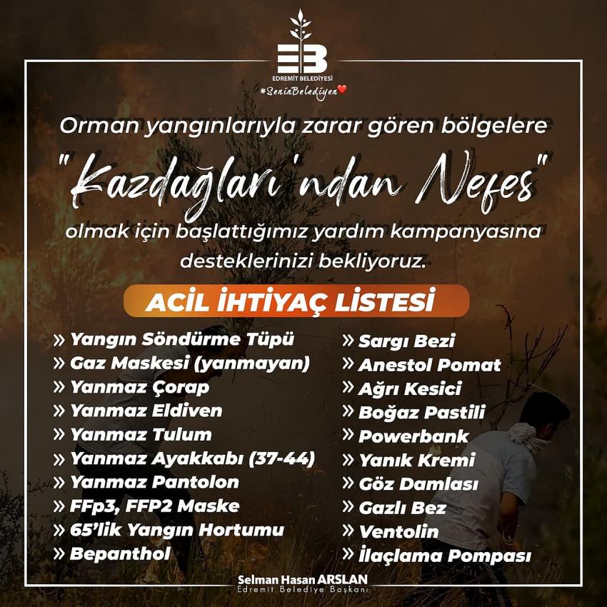 Edremit Belediyesi ülkemizde çıkan orman yangınları sebebiyle zarar gören bölgeler için yardım kampanyası başlattı. Edremit Belediye Başkanı Selman Hasan Arslan, “Kaz Dağları’ndan Nefes” kampanyasına destek vermeye tüm Edremitlileri davet etti.