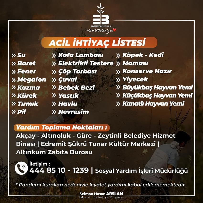 Ülkemizin farklı bölgelerinde 7 gündür süren yangınlar ormanlara verdiği ağır hasarın yanı sıra; insanların ve hayvanların da ciddi zarar görmesine yol açtı. Edremit Belediyesi Sosyal Yardım İşleri Müdürlüğü yetkililerle görüşerek bölgelerin acil ihtiyaçlarını tespit etti. Acil ihtiyaçlar liste yapılarak sosyal medyadan yayınlandı. Edremitliler zarar gören bölgelere destek olmaya davet edildi. Edremit Belediye Başkanı Selman Hasan Arslan, konuyla ilgili yaptığı açıklamada: “ Ülkemizde pek çok ayrı noktada çıkan orman yangınları sebebiyle zarar gören bölgelere gönderilmek üzere başlattığımız kampanyaya tüm Edremitlilerin desteğini bekliyoruz. Yaralarımızı birlikte saracak, bu zor günleri dayanışmayla atlatacağız” dedi.