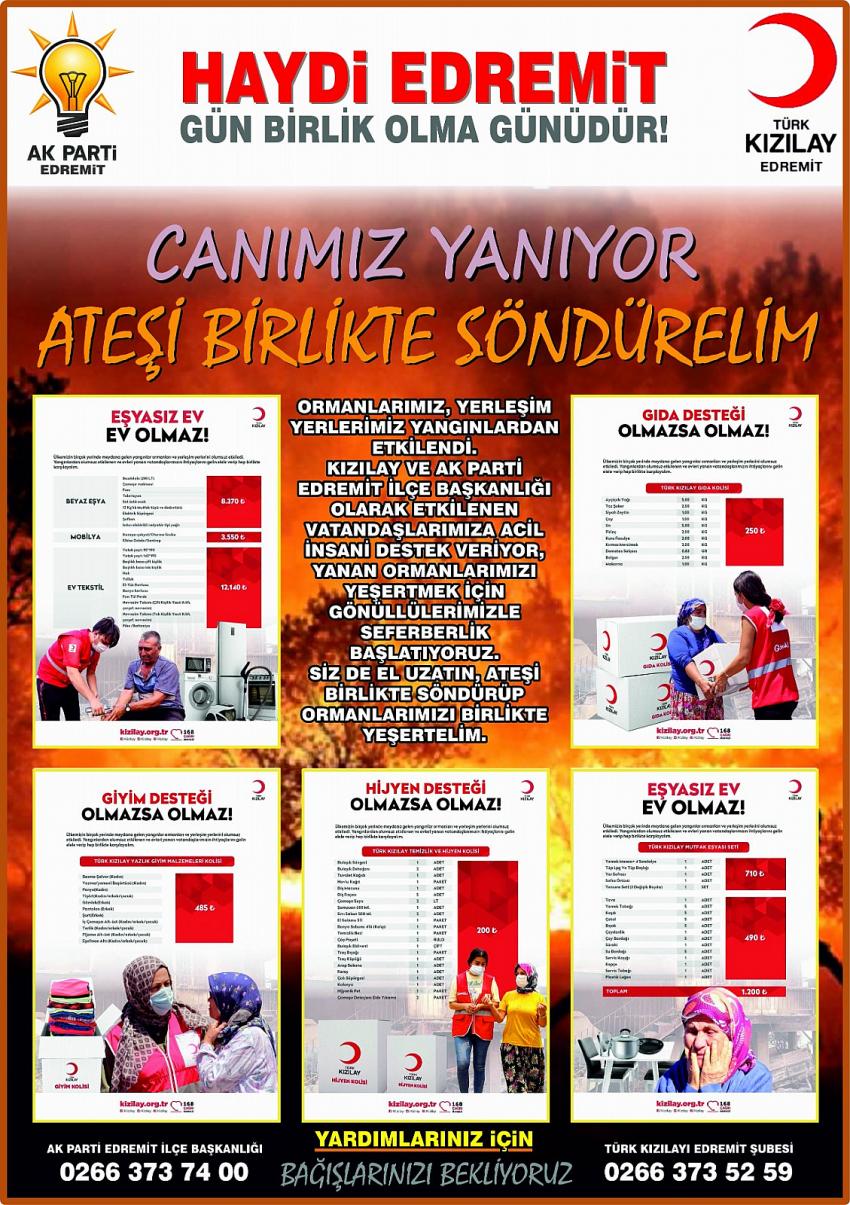 AK Parti Edremit İlçe Başkanlığı, Türk Kızılayı Edremit Şubesi ile ortaklaşa kampanya başlatarak, ülkenin farklı noktalarında yaşanan yangınlardan dolayı mağduriyetin giderilmesine katkı sağlamak amacıyla “Ateşi Birlikte Söndürelim” sloganıyla bir yardım kampanyası başlattı.