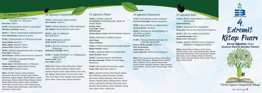 2017’den bu yana “Ölmez Ağacın Gölgesinde Kitap” sloganıyla yapılan fuar sekiz gün sürecek. 50’ye yakın yayınevinin ve 200’e yakın yazar, şair, gazeteci, belediye başkanı ve milletvekilinin katılacağı 4. Edremit Kitap Fuarı 17 Ağustos’ta sona erecek.
