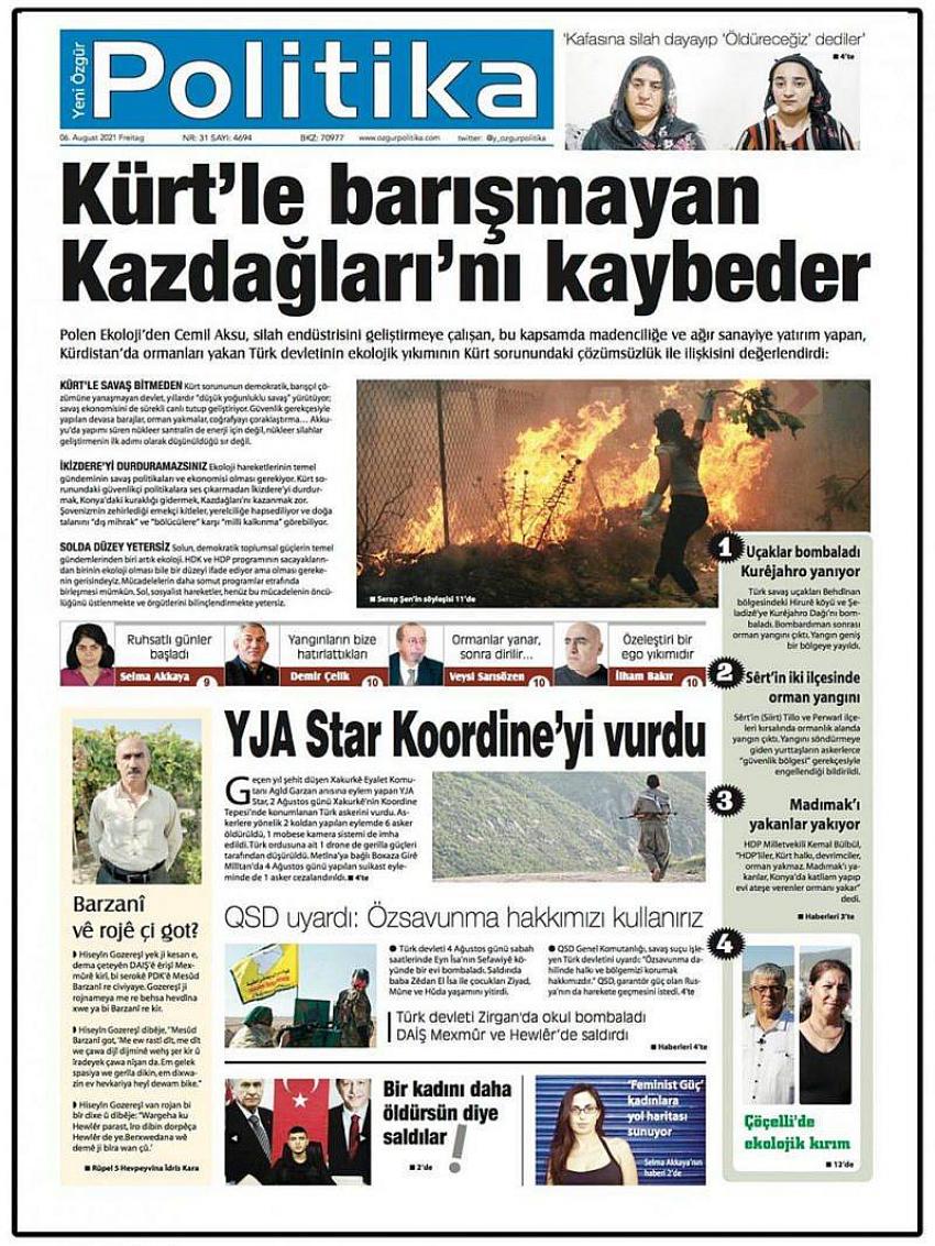 ''Kürt'le barışmayan Kaz Dağları'nı kaybeder'' başlıklı haberde, terör örgütünün paçavrası aleni bir şekilde Kaz Dağları'nı yakacaklarını ilan etti. Aynı satırlarda 'İkizdere'yi durdurmak ve Konya'daki kuraklığı bitirmek çok zor' ifadelerine de yer verildi.