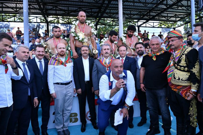 Başpehlivanlık güreşleri sonrası protokol üyeleri tarafından dereceye giren güreşçilere ödülleri verildi.