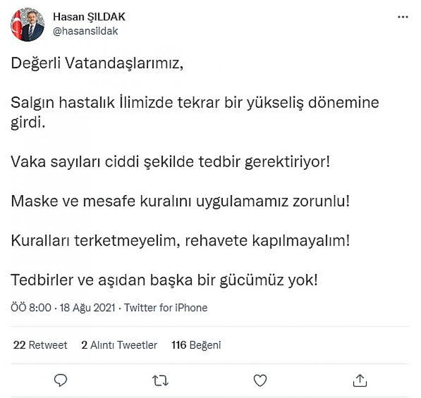 Vali Hasan Şıldak sosyal medya hesaplarından yaptığı paylaşımla salgınla ilgili uyarıda bulundu.