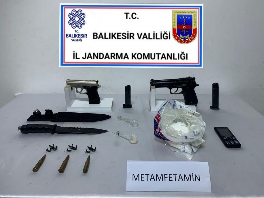 Balıkesir İl Jandarma Komutanlığı unsurlarınca 6136 Sayılı Kanuna Muhalefet ve Uyuşturucu Madde İmal ve Ticareti suçlarına yönelik yapılan çalışma neticesinde, Edremit İlçesi Cumhuriyet Mahallesinde G.D. isimli şahsın ikametinde yapılan aramada; (2) adet kurusıkı tabanca, (1) adet 30 cm uzunluğunda kasatura, (3) adet 7,6 mm çapında fişek, (160) gr metamfetamin ve (2) adet payp (uyuşturucu madde kullanma aparatı) ele geçirilmiştir. Şüpheli şahıs gözaltına alınarak gerekli adli işlemlere başlanılmıştır.