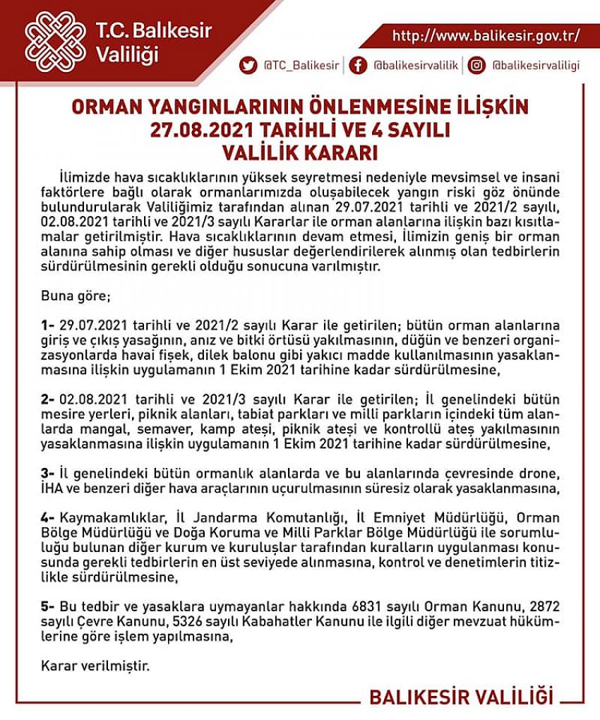 1-29.07.2021 tarihli ve 2021/2 sayılı Karar ile getirilen; bütün orman alanlarına giriş ve çıkış yasağının, anız ve bitki örtüsü yakılmasının, düğün ve benzeri organizasyonlarda havai fişek, dilek balonu gibi yakıcı madde kullanılmasının yasaklanmasına ilişkin uygulamanın 1 Ekim 2021 tarihine kadar sürdürülmesine,