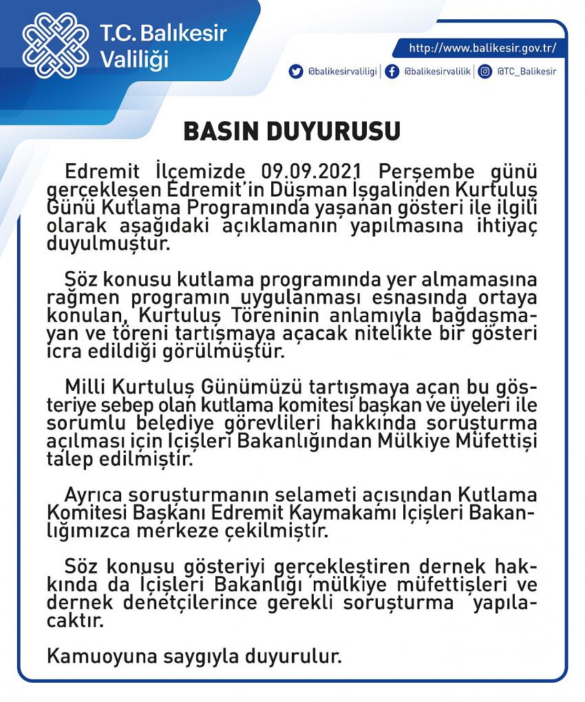 Balıkesir Valiliği Edremit’in Düşman İşgalinden Kurtuluş Günü Kutlama Programında yaşanan gösteri ile ilgili olarak açıklama yayınladı.