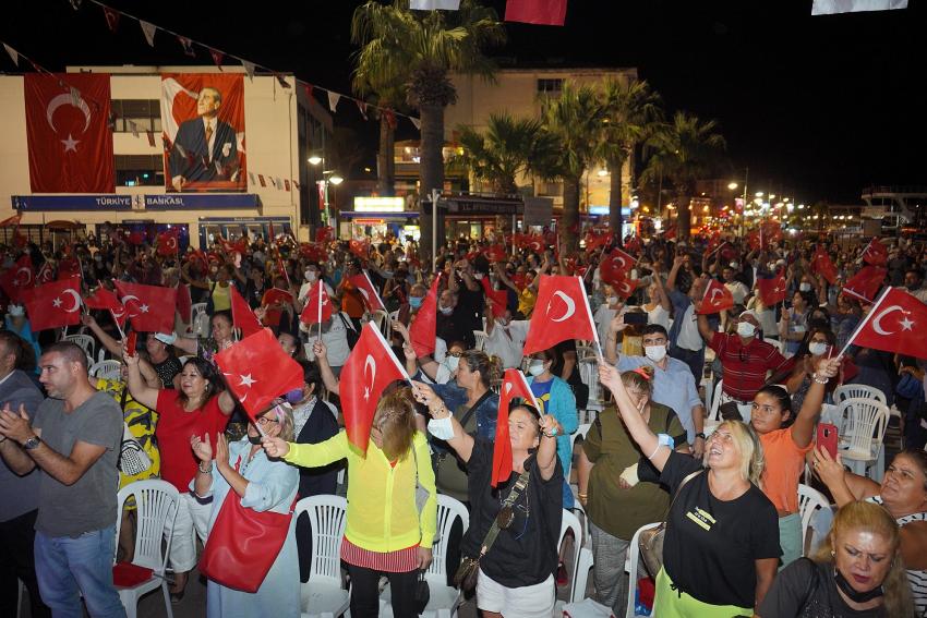 15 Eylül Ayvalık'ın düşman işgalinden kurtuluşunun 99. yıl dönümü kutlamaları kapsamında, Cumhuriyet Meydanı'nda düzenlenen konserde Murat Mermer ve orkestrasının seslendirdiği şarkılara yüzlerce Ayvalıklı da eşlik ederek adeta dev bir koro oluşturdu.