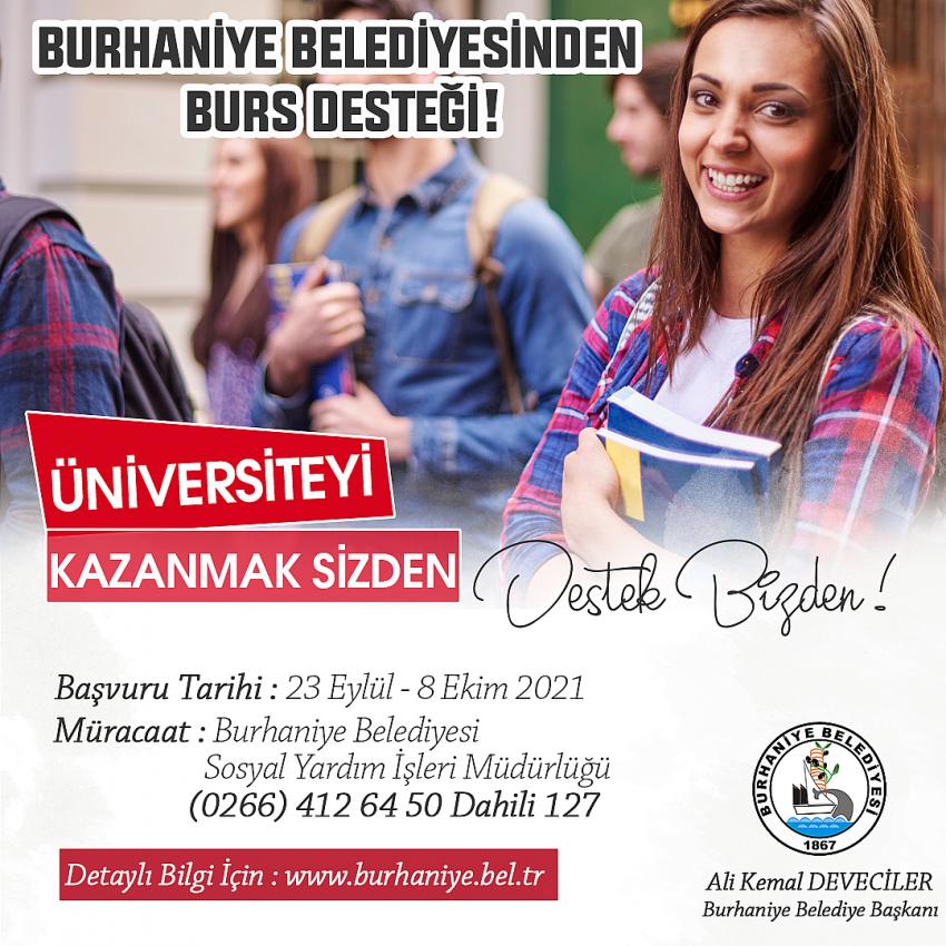 Başkan Deveciler, Üniversite de okuyan ve Türkiye’nin geleceğini inşa edecek olan gençlere belediyenin imkânları dâhilinde karşılıksız burs verileceğini açıkladı. Başkan Deveciler açıklamasında, Burhaniye Belediyesi olarak, yarınlarımıza şekil verecek olan geleceğimizin teminatı üniversiteli gençlere destek sağlamak amacıyla bir projeyi daha hayata geçirmenin mutluluğunu yaşıyoruz. Bu amaçla bu yıl üniversiteye kayıt yaptıran ve okumakta olan ilçe sınırlarımızda kendisi veya ailesi ikamet eden gençlere eğitim yardımı vereceğiz dedi.