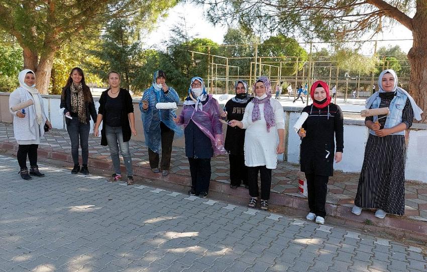 VELİLERLE BİRLİKTE OKULUN DUVARINI BOYAYAN AK KADINLAR, ÖĞRENCİLERLE İP ATLAYIP OYUNLAR OYNADI