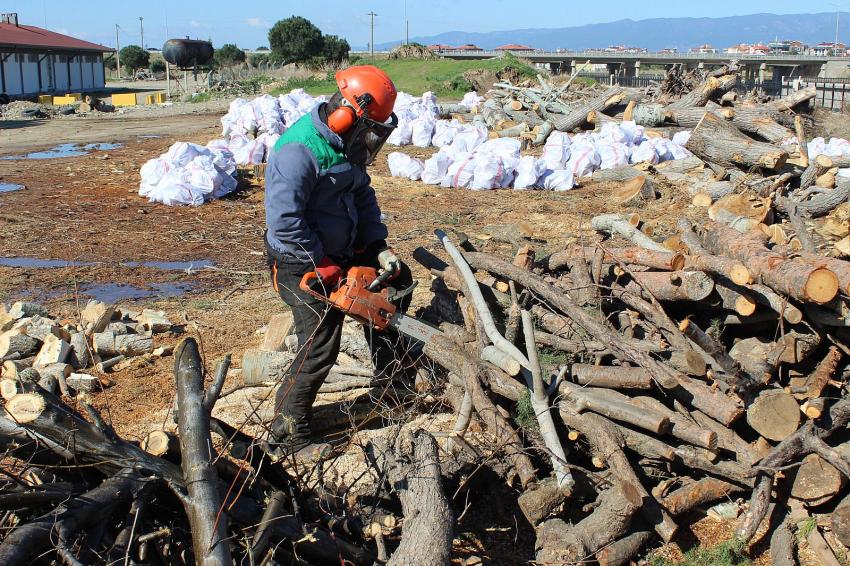 Soğuk kış günlerinde ihtiyaç sahibi vatandaşları unutmayan ve yakacak yardımlarına başlayan Burhaniye Belediyesi, şehir genelinde budama yapılan ağaçlardan elde edilen odunları şantiyede kesip çuvallıyorlar.