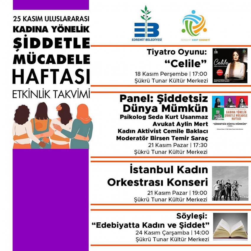 Edremit Belediyesi desteğinde, Edremit Kent Konseyi olarak 25 Kasım'da "Kadına Yönelik Şiddete Karşı Uluslararası Mücadele Günü" kapsamında, 17 - 25  Kasım tarihleri arasında 9 gün sürecek olan paneller, söyleşiler, tiyatro ve konserler ile “ŞİDDETE DUR DE” temasını işleyecek.