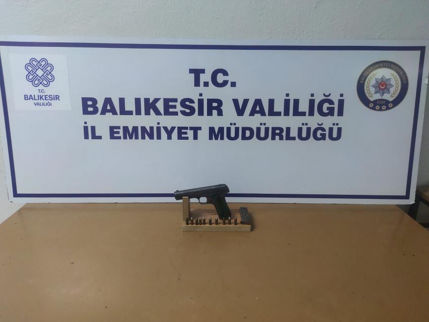 Balıkesir İl Emniyet Müdürlüğünce Balıkesir'de genel güvenliği ve asayişi sağlamak amacıyla İl Merkezinde, Ayvalık, Bandırma, Burhaniye, Edremit, Erdek, Gömeç, Gönen ve Marmara ilçelerinde 25.11.2021 tarihinde yapılan çalışmalarda (22) aranan şahıs yakalandı, (12) şahıs tutuklandı. Yapılan aramalarda; (1) adet kurusıkı tabanca, (4) adet ruhsatsız ateşli silah ve bu silahlara ait (27) adet fişek ele geçirildi.