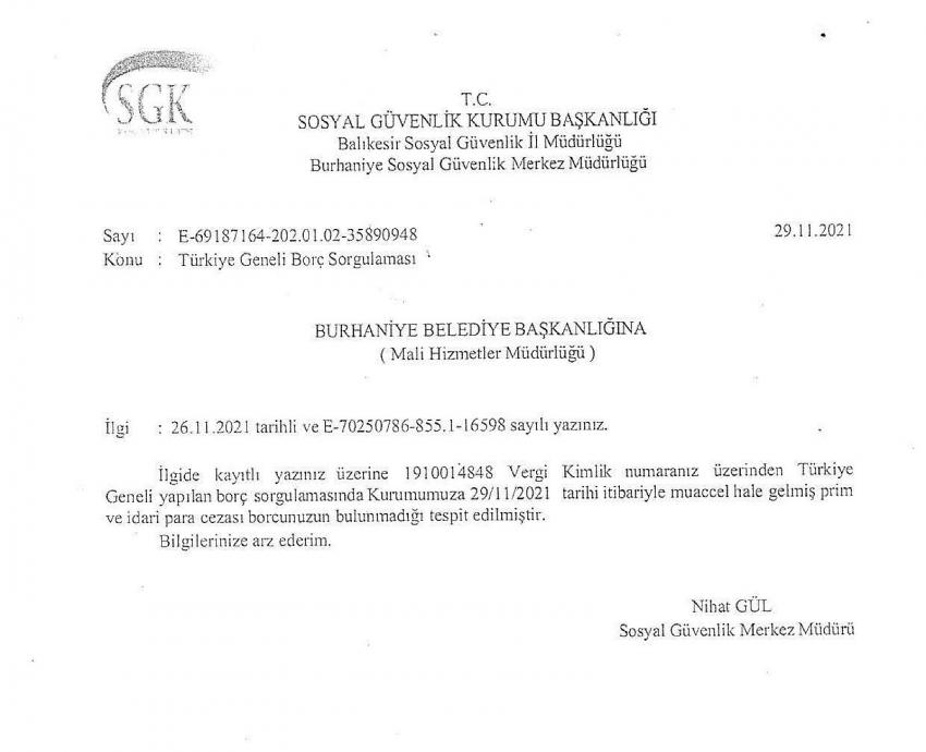 Burhaniye Belediyesi Sosyal Güvenlik Kurumuna (SGK) olan prim borçlarını ödeyerek, borcu olmayan çok az sayıda belediyelerden biri oldu. Sınırlı öz kaynaklarına rağmen hizmet üreten Burhaniye Belediyesi, birçok belediyenin kredi kullanarak prim ve SGK borçlarını ödemesine karşın, borçlarını sıfırladı.