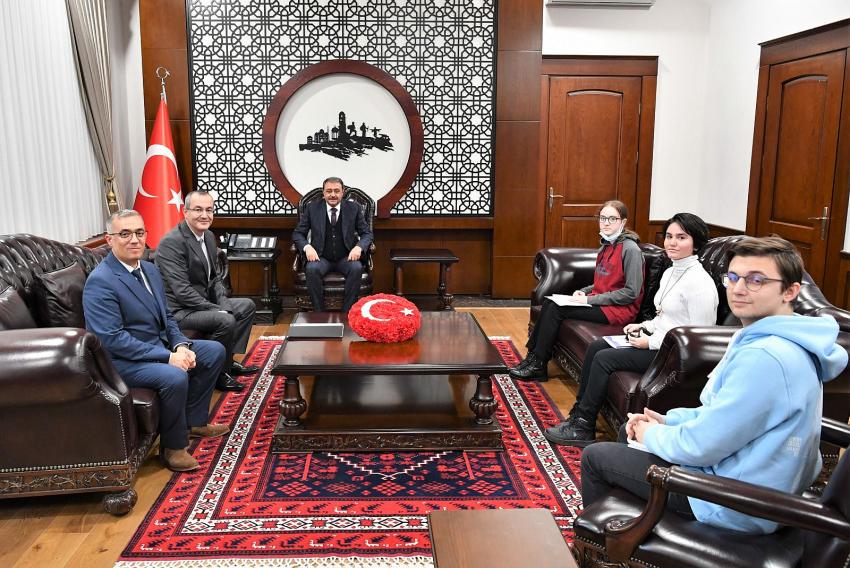 Karesi Şehit Prof. Dr. İlhan Varank Bilim ve Sanat Merkezi öğrencileri Hamza Bülbül, Ekin Umut Şener ve Zeynep Naz Erdem, Okul Müdürü Turgut Kıvanç ve Müdür Yardımcısı Hayret Başaran ile birlikte Vali Hasan Şıldak’ı ziyaret ettiler.