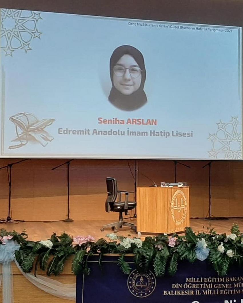 Millî Eğitim Bakanlığı Din Öğretim Genel Müdürlüğü tarafından 23.12.2021 Perşembe günü Balıkesir İl Müftülüğü Konferans Salonu’nda yapılan İmam Hatip Liseleri arası" Genç Muhafızlar” Hafızlık Yarışmasında, Edremit Anadolu İmam Hatip Lisesi Fen ve Sosyal Bilimler Proje Okulu Öğrencisi Seniha Arslan Balıkesir birincisi oldu.