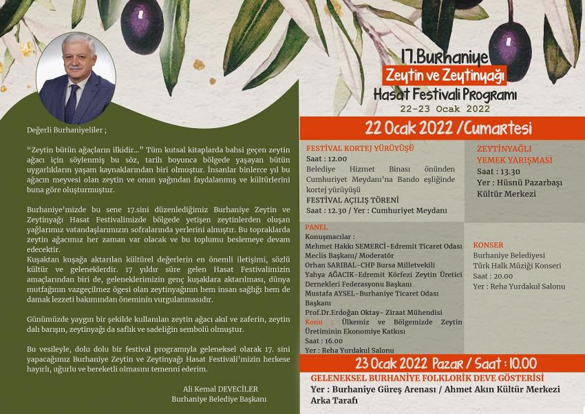 Geleneksel hale gelen “Zeytin ve Zeytinyağı Hasat Festivali” için çalışmalar tamamlandı. Geçtiğimiz yıl tüm dünyayı etkisi altına alan pandemi nedeniyle yapılamayan festivalin bu yıl 17. cisi düzenleniyor. 22 Ocak Cumartesi günü başlayacak ve iki gün sürecek festivalde geleneksel kültürümüzün yaşatılması ve genç kuşaklara aktarılması amaçlanmakta.