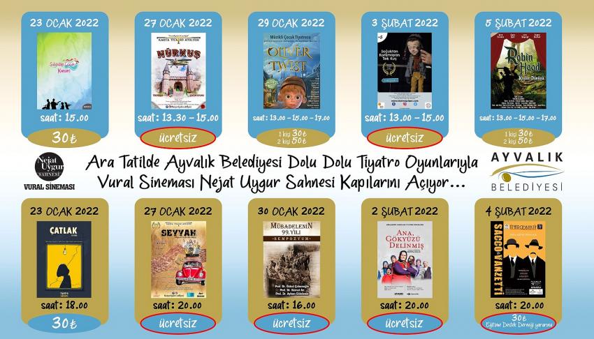 Tatil süresince, çocuklar için "Hürkuş" ve "Soğuktan Korkmayan Tek Kuş" ikişer seans, yetişkinler için Seyyah ve Ana Gökyüzü Delinmiş oyunları ücretsiz olarak sahnelenecek. Diğer oyunlarda ise 30 Türk lirası tek fiyat uygulanacak. Öte yandan Ayvalık Sanat Fabrikası’nın Sacco ve Venzetti oyunu, Eğitime Destek Derneği yararına 4 Şubat günü sahnelenecek.
