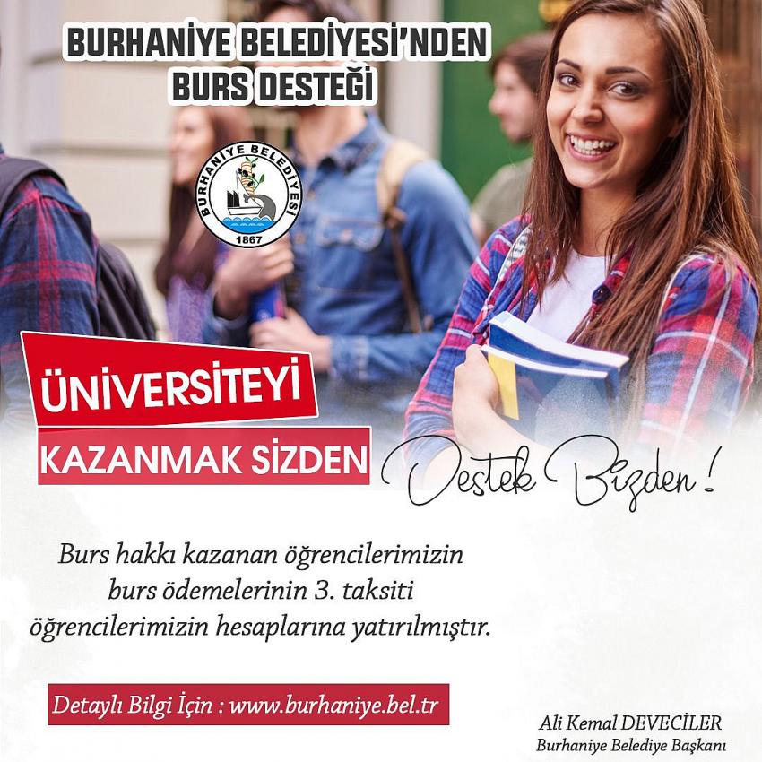 Aylık 400 TL olarak belirlenen ve 250 öğrencinin faydalandığı bursların 3. Taksiti de öğrencilerin hesaplarına yatırıldı. Burhaniye Belediye Başkanı Ali Kemal Deveciler, eğitim alanında üniversite öğrencilerinin faydalanması için bu projenin kurulan dernek üzerinden yürütüldüğünü ve ilçede üniversiteye giden ve durumu olmayan öğrencilere fayda sağladığını söyledi.