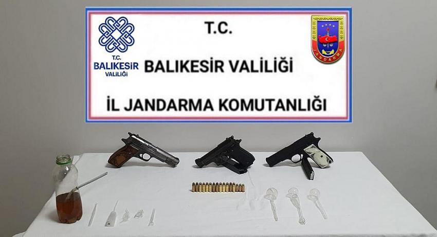 Balıkesir İl Jandarma Komutanlığınca, 6136 SKM ile uyuşturucu madde imal ve ticaretine yönelik yapılan istihbari çalışmalar neticesinde, Bandırma ve Edremit İlçelerinde uyuşturucu madde ve silah bulundurduğu tespit edilen (2) şüphelinin ikamet adresleri ve araçlarında yapılan aramalarda;  (3) adet tabanca, (126) adet tabanca fişeği ve (6) adet uyuşturucu kullanma aparatı ele geçirildi. Olaylarla ilgili (2) şüpheli yakalandı.