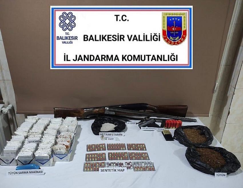 Balıkesir İl Jandarma Komutanlığınca, uyuşturucu madde imal ve ticaretine yönelik yapılan istihbari çalışmalar neticesinde, Kepsut İlçesinde uyuşturucu madde ticareti yaptığı tespit edilen (2) şüpheliye ait ikamet adreslerinde yapılan aramalarda; (105) gram uyuşturucu madde (metamfetamin), (124) adet sentetik uyuşturucu hap, (2) adet uyuşturucu kullanma aparatı, (155) adet dolu makaron, (850) gram tütün, (1) adet tütün sarma makinesi, (1) adet tabanca, (1) adet av tüfeği ve (25) adet fişek ele geçirildi. Olayla ilgili (2) şüpheli yakalandı.