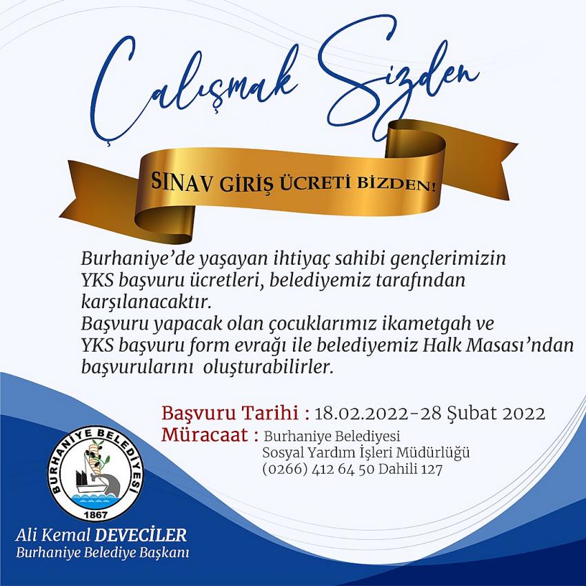 Burhaniye Belediyesi, ilçede yaşayan ihtiyaç sahibi ailelerin Yükseköğretim Kurumları Sınavı’na (YKS) girecek olan çocuklarının YKS başvuru ücretini ödeyecek. YKS ücreti desteğinden Burhaniye’de ikamet eden veya öğrenim gören lise son sınıf öğrencileri faydalanabilecek. YKS ücretleri için son başvuru tarihi 28 Şubat 2022 Pazartesi olup başvurular belediye hizmet binasında Sosyal İşler Müdürlüğüne İkametgah belgesi ve YKS başvuru formu ile yapılacak.