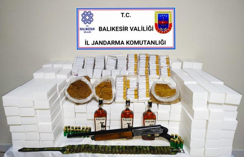 Balıkesir İl Jandarma Komutanlığınca, tütün mamulleri kaçakçılığına yönelik yapılan istihbari çalışmalar neticesinde, Sındırgı İlçesinde kaçak tütün mamulleri imal ve ticareti yaptığı tespit edilen (1) şüphelinin ev ve işyerinde yapılan aramada; (13) kilo açık kıyılmış tütün, (22.700) adet dolu makaron, (50.000) adet boş makaron, (3) litre kaçak içki, (1) adet av tüfeği ve (55) adet fişek ele geçirildi. Olayla ilgili (1) şüpheli yakalandı.