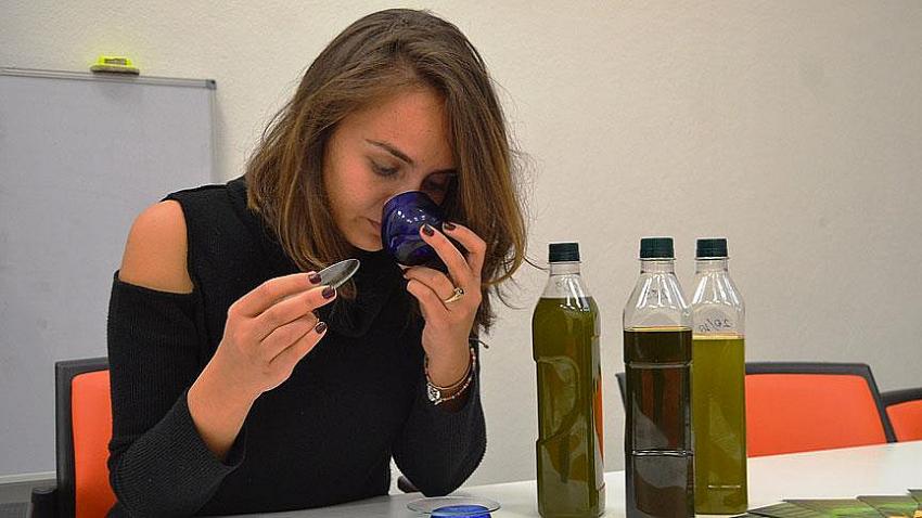 Tadım konusunda çalışmaları aksatmayan ve duyularını geliştirecek her türlü aktiviteyi takip eden grup, laboratuvar sorumlusu Tuna SALON yardımıyla, eğitmen Dr. Dilşen OKTAY ERTEM’in hazırladığı zeytinyağı numunelerini tadıp değerlendiriyorlar.