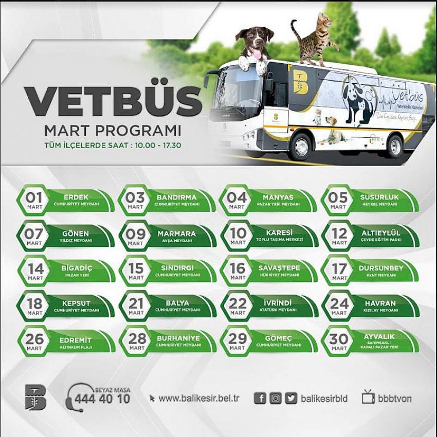 1 Mart Erdek’te yolculuğuna başlayan VETBÜS, 3 Mart (bugün) Bandırma Cumhuriyet Meydanı, 4 Mart Manyas Pazar Yeri Meydanı, 5 Mart Susurluk Heykel Meydanı, 7 Mart Gönen Yıldız Meydanı, 9 Mart Marmara Avşa Meydanı, 10 Mart Karesi Toplu Taşıma Merkezi, 12 Mart Altıeylül Çevre Eğitim Parkı, 14 Mart Bigadiç Pazar Yeri, 15 Mart Sındırgı Cumhuriyet Meydanı, 16 Mart Savaştepe Hürriyet Meydanı, 17 Mart Dursunbey Kent Meydanı, 18 Mart Kepsut Cumhuriyet Meydanı, 21 Mart Balya Cumhuriyet Meydanı, 22 Mart İvrindi Atatürk Meydanı, 24 Mart Havran Kızılay Meydanı, 26 Mart Edremit Altınkum Plajı, 28 Mart Burhaniye Cumhuriyet Meydanı, 29 Mart Gömeç Cumhuriyet Meydanı ve 30 Mart Ayvalık Sarımsaklı Kapalı Pazar Yerinde olacak.