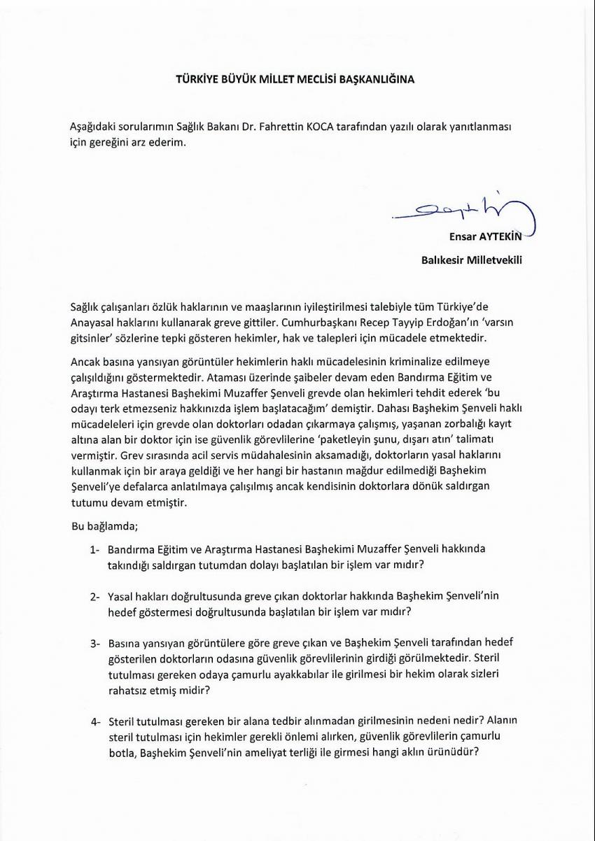 CHP Balıkesir Milletvekili ve İçişleri Komisyonu Üyesi Ensar Aytekin, Anayasal haklarını kullanarak greve giden hekimlerin Bandırma Eğitim ve Araştırma Hastanesi Başhekimi Muzaffer Şenveli tarafından tehdit edilmesini TBMM gündemine taşıdı. Sağlık Bakanı Fahrettin Koca tarafından yanıtlanması talebiyle soru önergesi veren Aytekin; “bir hekim olarak hekimlere uygulanan zorbalık sizlerin vicdanını rahatsız ediyor mu?” diye sordu.