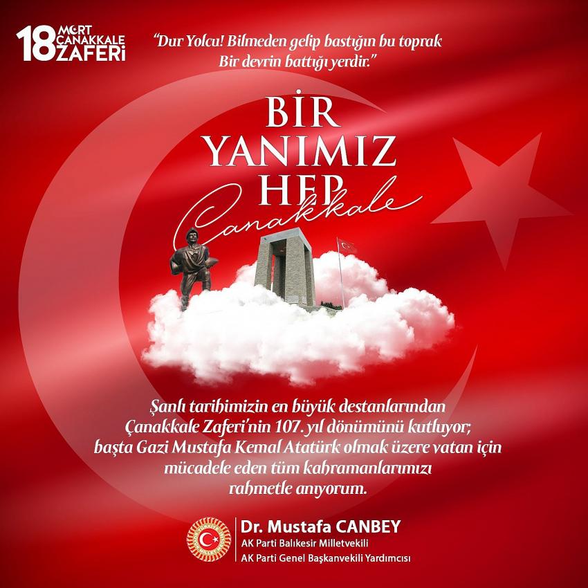 AK Parti Balıkesir Milletvekili Dr. Mustafa Canbey, 18 Mart Şehitleri Anma Günü ve Çanakkale Zaferi’nin 107. yıl dönümü dolayısıyla bir mesaj yayımladı.