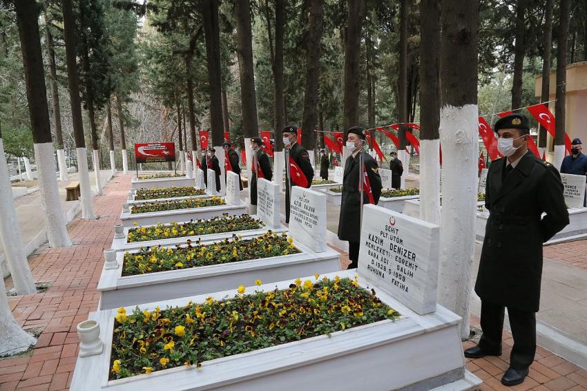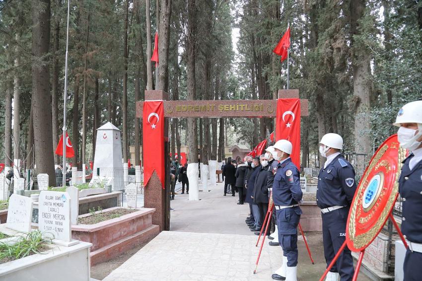 Edremit Kaymakamı Odabaş, 19. Motorlu Piyade Tugay Komutanı P.Alb. Canbey ve Edremit Belediye Başkanı Arslan, Balıkesir Milletvekili Ensar Aytekin, Cumhuriyet Başsavcısı Çetin Güzel ve Cumhuriyet Başsavcısı Çetin Güzel ve protokol tarafından şehit mezarlarına çiçek bırakıldı. Ardından polis şehitliğine geçilerek çiçek bırakılması ve dualar eşliğinde programı sona erdi