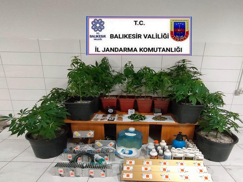 Balıkesir İl Jandarma Komutanlığınca, uyuşturucu madde imal ve ticaretine yönelik yapılan istihbari çalışmalar neticesinde, Edremit İlçesinde evinde düzenek kurmak suretiyle kenevir bitkisi yetiştirdiği ve uyuşturucu madde ticareti yaptığı tespit edilen (3) şüphelinin ikamet adresinde yapılan aramalarda; (1.332) gram uyuşturucu madde (kubar esrar), (31) kök kenevir, (4) gram kenevir tohumu, (1) adet uyuşturucu kullanma aparatı, (3) adet termometre, (1) adet buhar makinası, (1) adet fan, (9) adet led lamba, (29) litre sıvı gübre, (1) adet klima, (1) adet hassas terazi ve suçtan elde edilen (2.300) TL ele geçirildi. Olayla ilgili (3) şüpheli yakalandı.