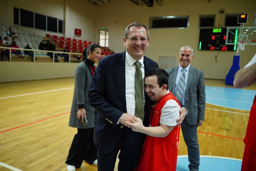 Ayvalık Belediye Başkanı Mesut Ergin, Ayvalık Belediyesi Özel Çocuklar Eğitimevi’nde öğrenim gören down sendromlu çocukları basketbol antrenmanlarında ziyaret etti. Başkan Ergin, çocuklarla uzun süre sohbet edip ardından basketbol maçlarının hava atışını yaptı. Özel çocukların basketbol müsabakasını tribünden takip eden Başkan Ergin, maç sonunda özel çocuklara kupa ve madalyalarını verdi. Başkan Ergin’e sevgi gösterisinde bulunan çocukların mutlulukları gözlerinden okundu.
