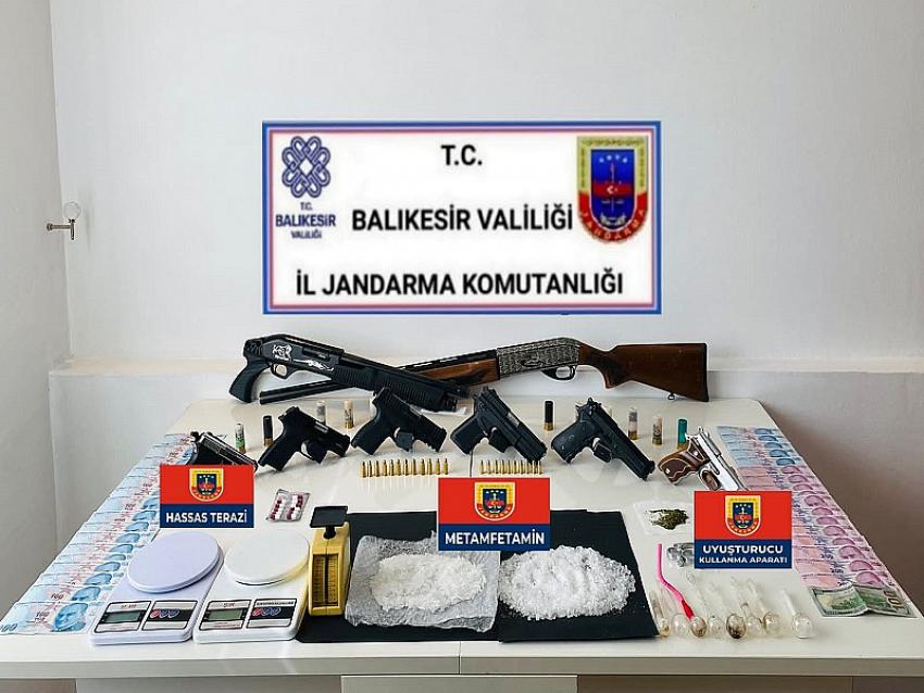 Balıkesir İl Jandarma Komutanlığınca, uyuşturucu madde imal ve ticaretine yönelik yapılan istihbari çalışmalar neticesinde, Altıeylül İlçesinde örgütlü olarak uyuşturucu madde ticareti yaptıkları tespit edilen (19) şüphelinin ikamet adreslerinde yapılan aramalarda; (610) gram metamfetamin, (7) gram kubar esrar, (11) adet sentetik uyuşturucu hap, (8) adet uyuşturucu kullanma aparatı, (3) adet hassas terazi, (1) adet muşta, (6) adet tabanca, (2) adet av tüfeği, (12) adet av tüfeği kartuşu, (26) adet tabanca fişeği ve (3.215) TL ile (100) dolar suçtan elde edilen gelir olarak ele geçirildi. Olayla ilgili (18) şüpheli yakalandığı (1) şüphelinin yakalama çalışmalarına devam edilmekte olduğu öğrenildi.