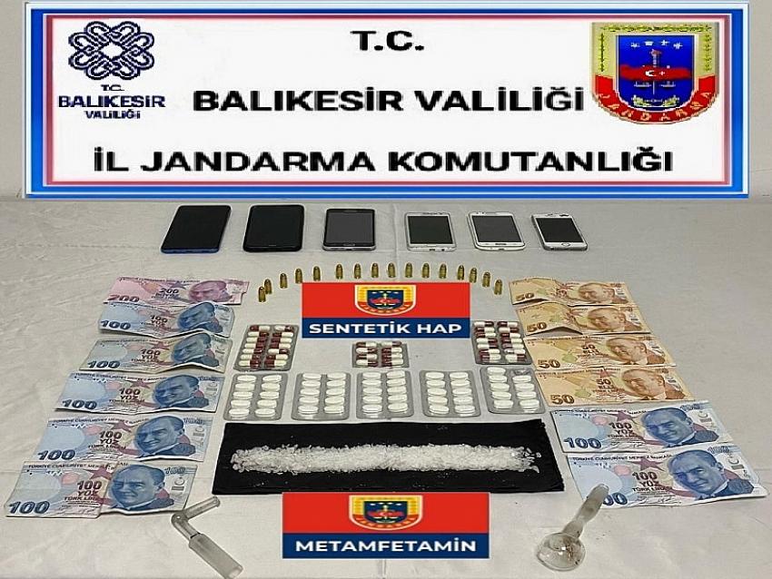 Balıkesir İl Jandarma Komutanlığınca, uyuşturucu madde imal ve ticaretine yönelik yapılan istihbari çalışmalar neticesinde, Bigadiç İlçesinde uyuşturucu madde ticareti yaptıkları tespit edilen (6) şüphelinin ikamet adreslerinde yapılan aramalarda; (50) gram metamfetamin, (85) adet sentetik uyuşturucu hap (gerica), (2) adet uyuşturucu kullanma aparatı, (6) adet cep telefonu, (16) adet tabanca fişeği ve suçtan elde edilen gelir olarak (2.000) TL ele geçirildi.