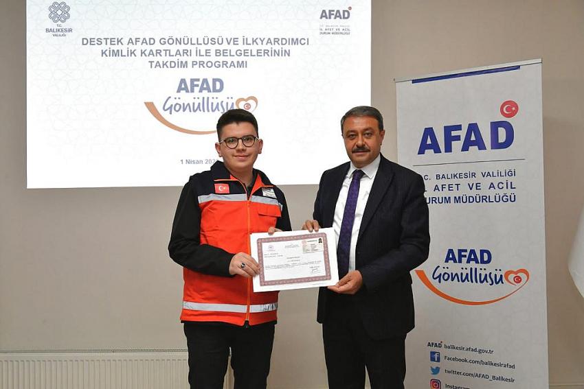Destek Afad Gönüllüsü ve İlk Yardımcı Kimlik Kartları İle Belgelerinin verildiği İl Afet ve Acil Durum Müdürlüğünde düzenlenen program AFAD Gönüllüsü video gösterimi ile başladı. Programın açılışında konuşan İl Afet ve Acil Durum Müdürü Bayram Şahin Balıkesir’de afetlere karşı yapılan hazırlıklar, 2021 Balıkesir Afet Eğitim Yılı Projesi kapsamında eğitimler ve 2022 yılının Afet Tatbikat Yılı ilan edilmesiyle ilgili tatbikatlar hakkında bilgi verdi. Müdür Şahin Balıkesir’de sisteme kayıt yaptıran AFAD Gönüllüsü sayısının 5 bin 786, 721 kişinin ise Temel AFAD Gönüllüsü olduğu bilgisini vererek Balıkesir’in afetlere ve acil durum hallerine hazır olduğunu söyledi.