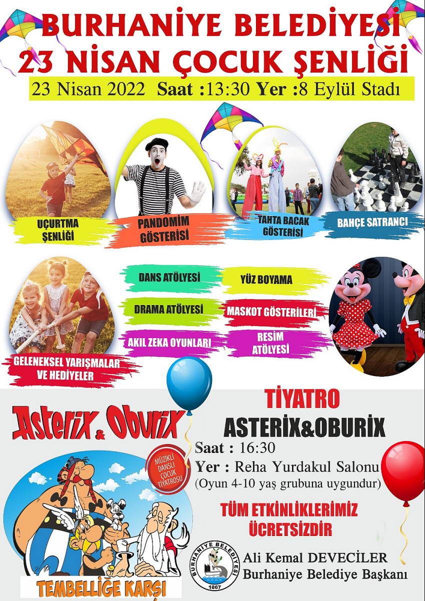23 Nisan Çocuk Şenliği programı daha sonra saat 16.30’da Reha Yurdakul Kültür Merkezinde 4-10 yaş çocukları için Asterix& Oburix isimli tiyatro oyunuyla son bulacak.