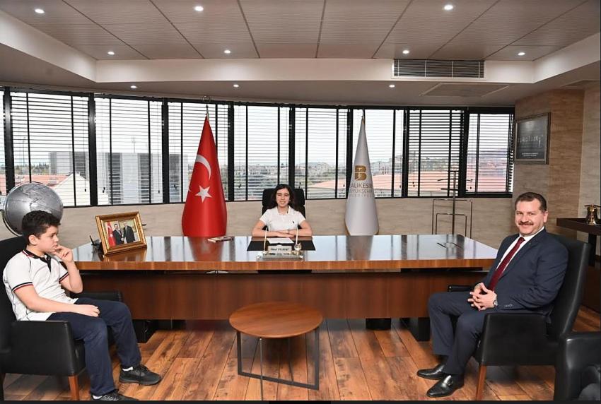 Balıkesir Büyükşehir Belediye Başkanı Yücel Yılmaz, her 23 Nisan günü olduğu gibi bu yılda Ulusal Egemenlik ve Çocuk Bayramı’nda makamını çocuklara devretti. Kendisinin de ilk mezunlarından olduğu Mehmet Şeref Eğinlioğlu Ortaokulu öğrencilerini ağırlayan Başkan Yücel Yılmaz; 7. sınıf öğrencisi Emira Ayşe Ergün ve 6. sınıf öğrencisi Ahmet Kerem Uysal’la yakından ilgilendi. Başkan Yücel Yılmaz’a; eşi Mehtap Yılmaz, İl Milli Eğitim Müdürü Ali Tatlı, Mehmet Şeref Eğinlioğlu Ortaokulu Müdürü Raşettin Dağ, Türkçe Öğretmeni Serpil Adagün, Teknoloji ve Tasarım Öğretmeni Cemile Ergün ve çocukların aileleri eşlik etti.
