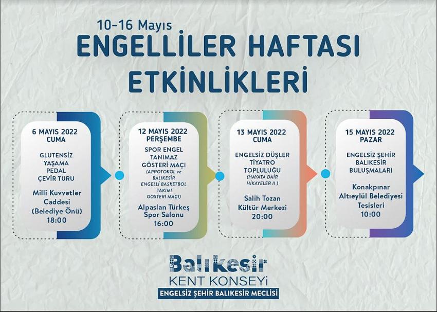 12 Mayıs Perşembe günü saat 16.00’da Alparslan Türkeş Spor Salonu’nda Balıkesir protokolü, Balıkesir Engelli Basketbol Takımı ile gösteri maçına çıkacak. 13 Mayıs Cuma günü saat 20.00’de ise Salih Tozan Kültür Merkezi’nde Engelsiz Düşler Tiyatro Topluluğu tarafından sahnelenecek olan “Hayata Dair Hikâyeler II” adlı tiyatro oyunuyla seyirciyle buluşacak. 15 Mayıs Pazar günü saat 10.00’da da Konakpınar Altıeylül Belediyesi Tesislerinde Engelsiz Şehir Balıkesir Buluşması gerçekleştirilecek.