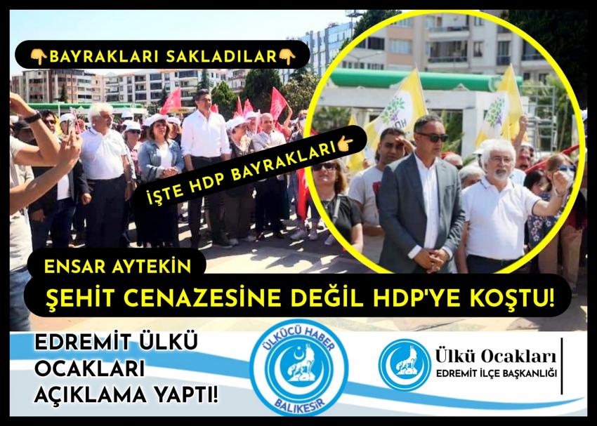 Edremit'te Canan Kaftancıoğlu'na destek için CHP'nin yaptığı basın açıklamasında sallanan HDP bayraklarına tepkiler devam ediyor. Edremit Ülkü Ocakları Başkanı Gökhan Takyesizoğlu, şehit cenazesine katılmak yerine, HDP bayraklı açıklamaya koşan Milletvekili Ensar Aytekin'e yüklendi.