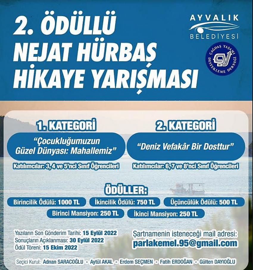 Ayvalık Belediyesi Çağdaş Yaşam Türkel Minibaş Gençlik ve Çocuk Kütüphanesi iki ayrı kategoride 2. Nejat Hürbaş Hikaye Yarışması düzenledi. 6, 7 ve 8’inci sınıflar için “Deniz Vefakar Bir Dosttur ” 3, 4 ve 5’inci sınıflar için ise “Çocukluğumuzun Güzel Dünyası: Mahallemiz” yarışma konusu olarak belirlendi.